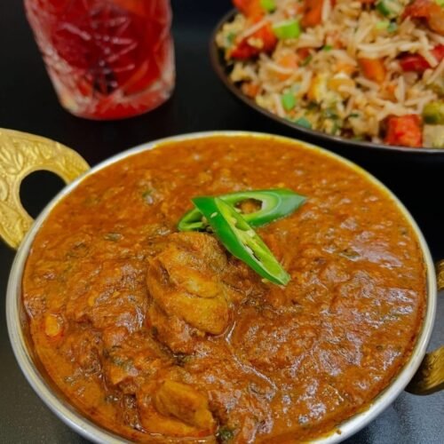 Homemade-style boneless chicken curry cooked with traditional way from north india with whole spice in mustard oil with onion tomatoes based gravy